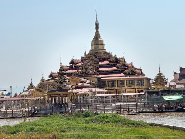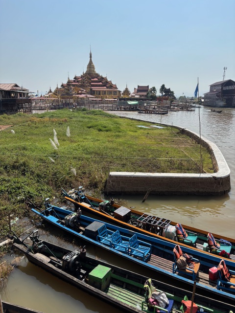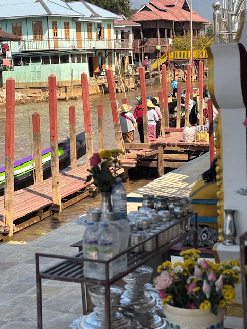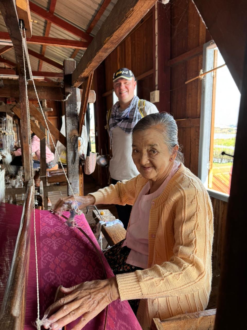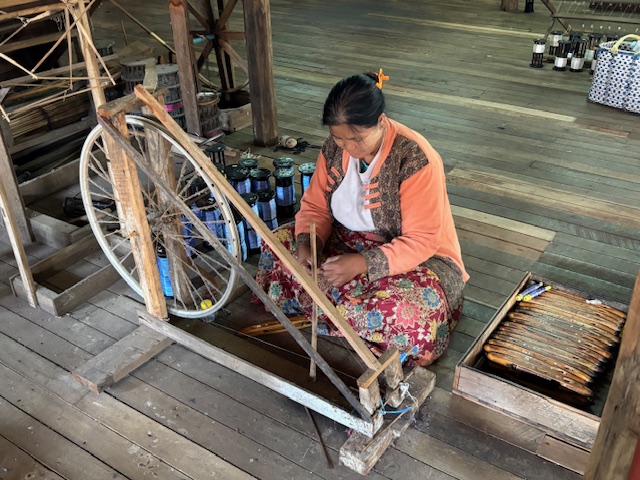 W pewnym momencie dopłynęliśmy do brzegu, gdzie cumowało wiele łodzi. Sternik wskazał mi wąską ścieżkę prowadzącą na lokalny targ, minąłem kobiety z górskich plemion, w kolorowych chustach na głowach, sprzedające drewno na opał. Ich twarze były spokojne, skupione. Później znów wsiedliśmy do łodzi i popłynęliśmy do bardziej turystycznego miejsca, domu na palach, gdzie powstają tkaniny. Młoda Birmanka oprowadziła mnie po warsztacie, tłumacząc cały proces: od pozyskiwania włókien, przez tkanie i farbowanie, aż po gotowe produkty – longyi, koszule, torby. Jedwab, bawełna, lotos – wszystko kolorowe, misternie wykonane i do kupienia.
