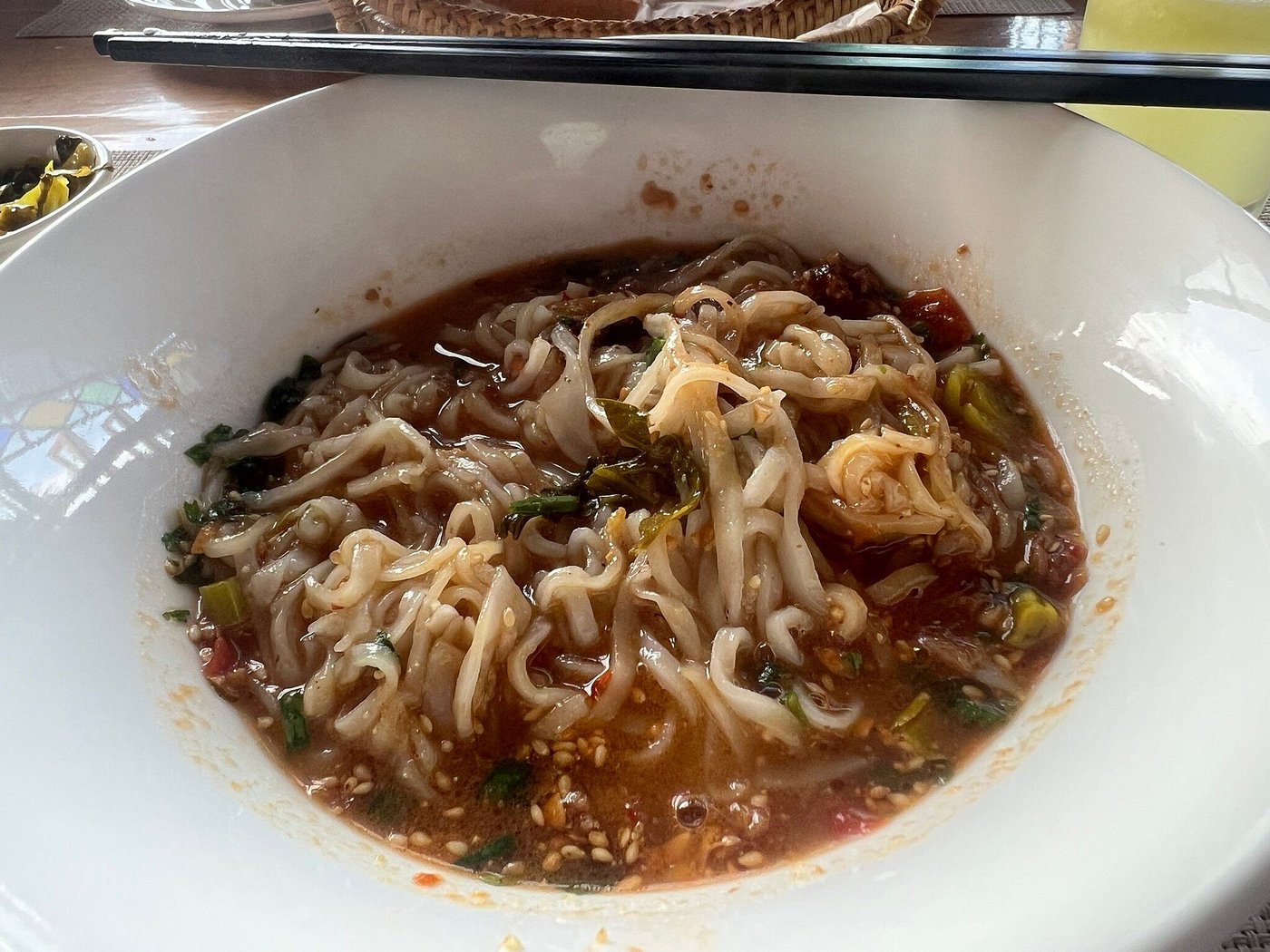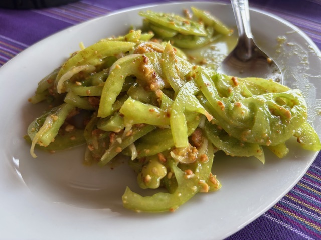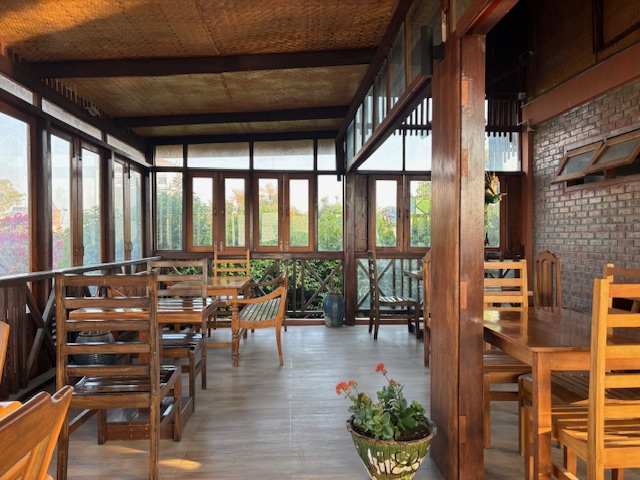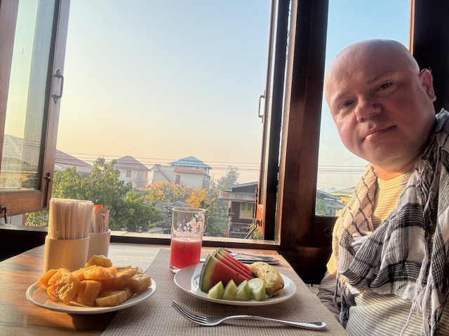 Śniadanie zjadłem na piętrze, na pięknym tarasie z widokiem na okolicę. Byłem jedynym gościem, ale wcale mi to nie przeszkadzało. Omlet, świeże owoce, kawa i oleiste, pikantne shwenoodle z kurczakiem, które okazały się dla mnie zbyt specyficzne.