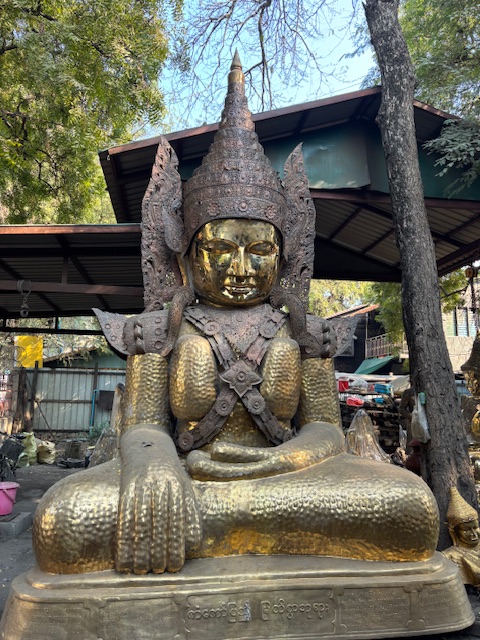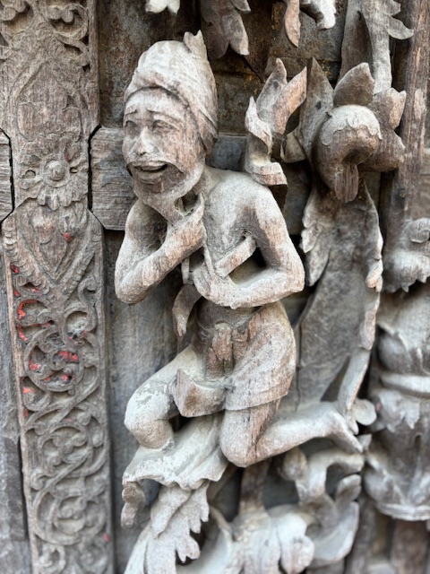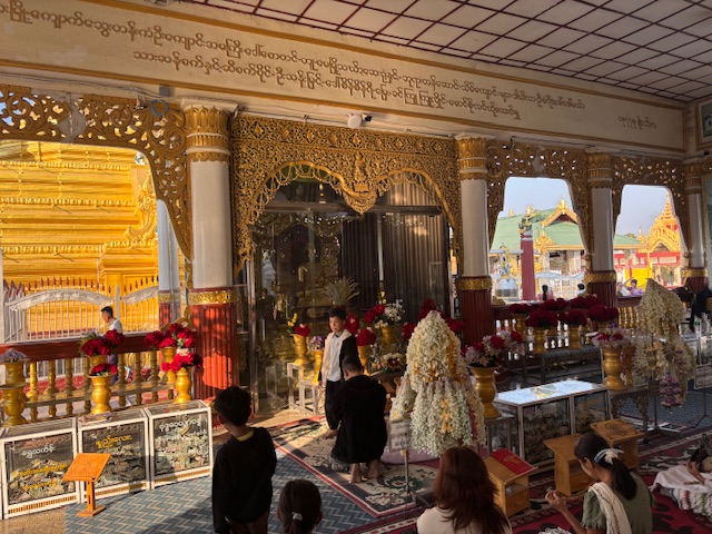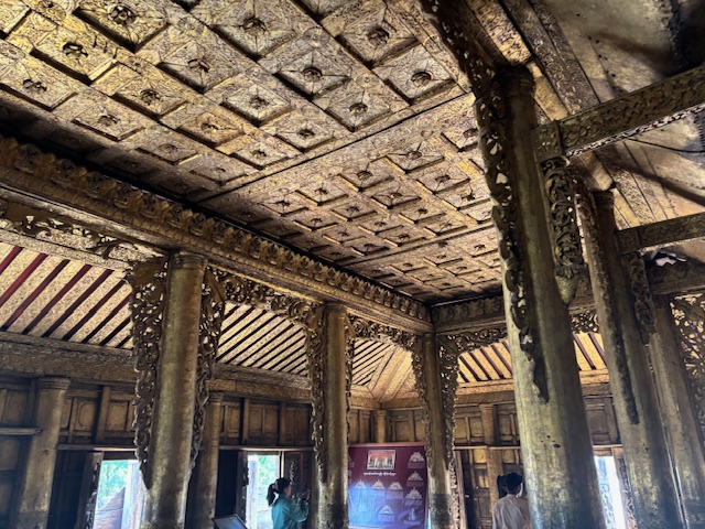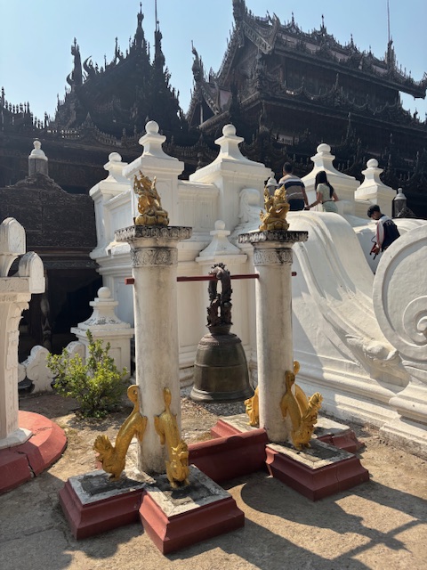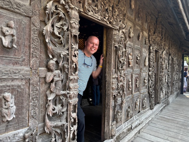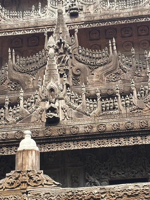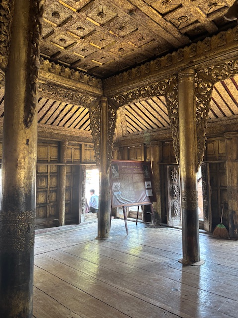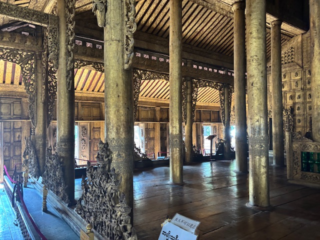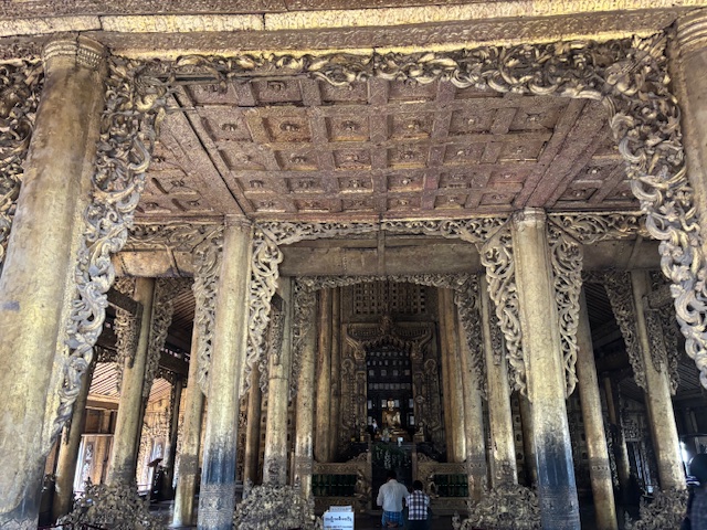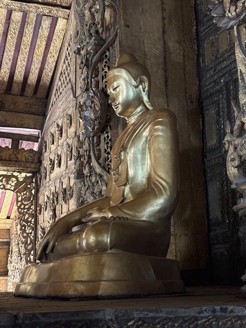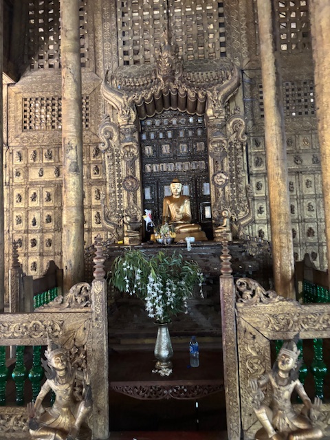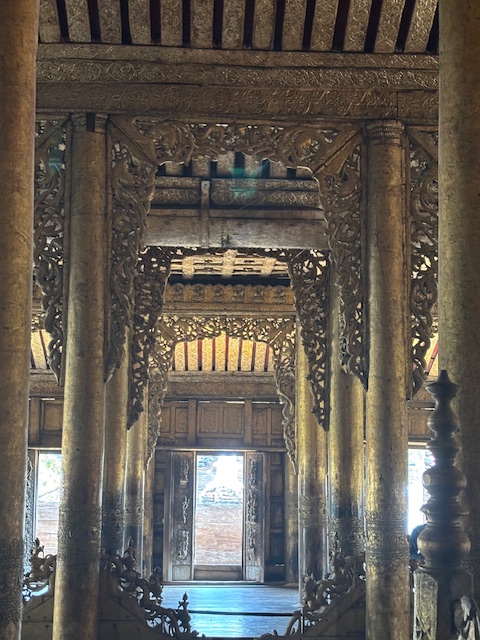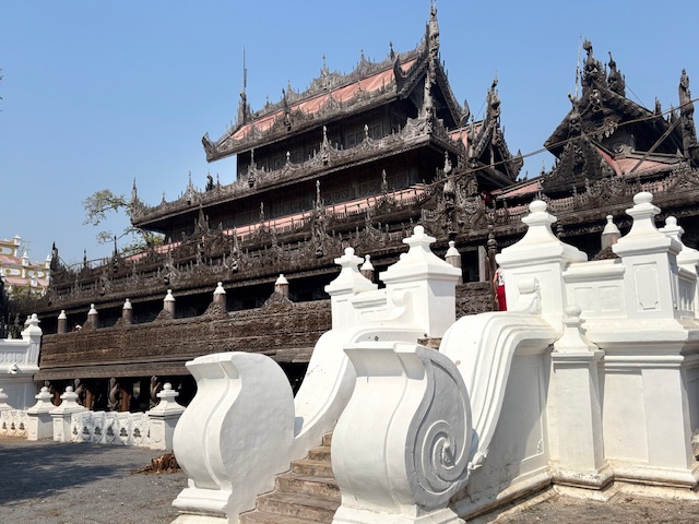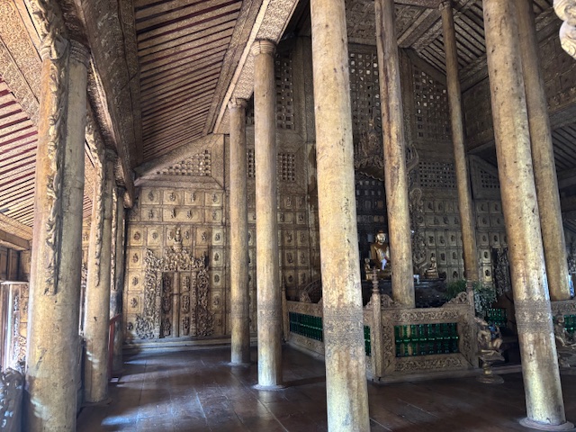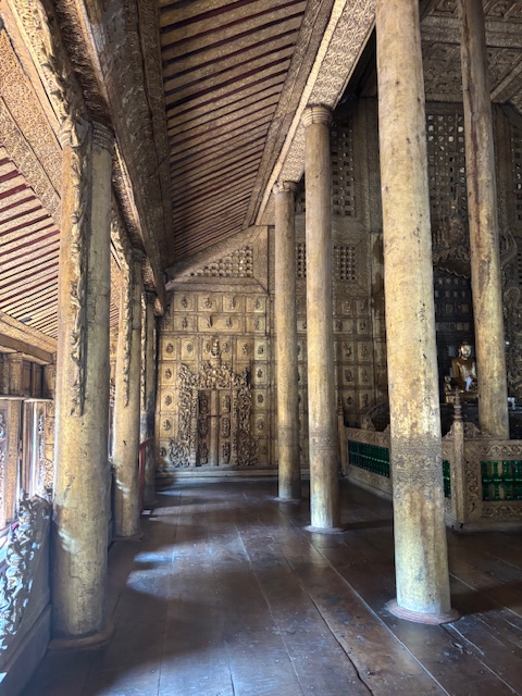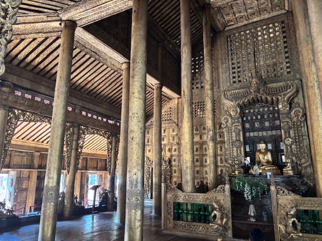 Po lunchu odwiedziliśmy tekową świątynię – monastyr Shwenandaw. Ma ponad 120 lat i już od pierwszego spojrzenia zachwycał niezwykłą ilością misternych rzeźbień, które pokrywają niemal każdy fragment budowli – zarówno na zewnątrz, jak i wokół ołtarza. A jednak sama świątynia wydaje się zaskakująco skromna. W środku panuje półmrok, a drewniana podłoga skrzypi przy każdym kroku. Byłem tam jedynym zagranicznym turystą. Ludzie przyglądali mi się z ciekawością, ale zaraz potem pojawiały się uśmiechy.