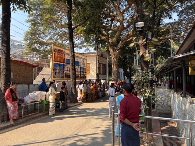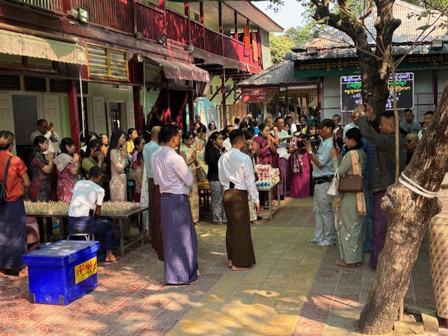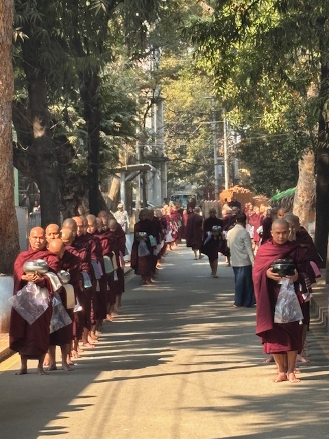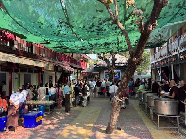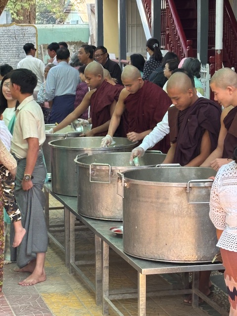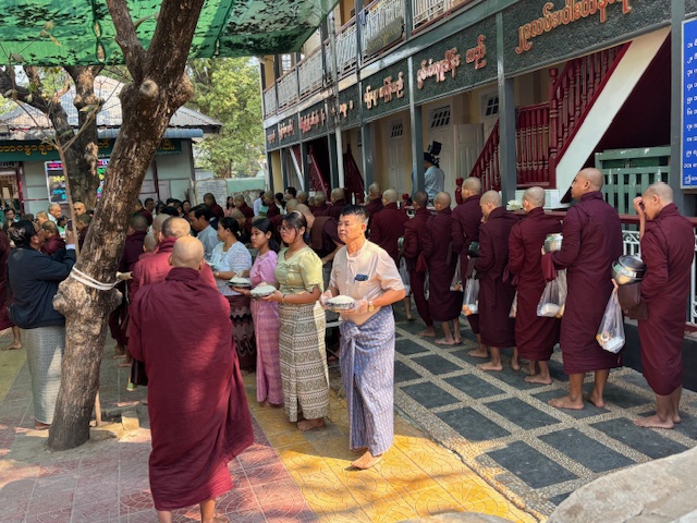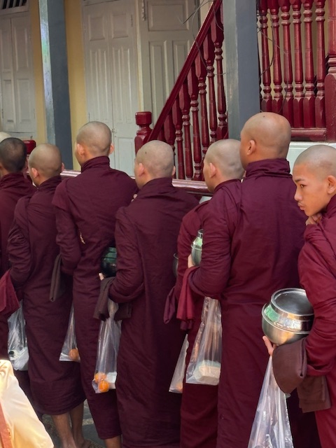 Do kompleksu świątynnego dotarliśmy przed 10:00 rano, żeby zobaczyć jeden z najważniejszych momentów dnia – ceremonię śniadania. Gdy weszliśmy na dziedziniec klasztoru, naszym oczom ukazały się dwie długie kolumny mnichów ustawionych od najstarszego do najmłodszego. W pełnym skupieniu czekali na dźwięk dzwonu, który miał dać znak rozpoczęcia posiłku. Widok był naprawdę niezwykły. Z wielkich garów rozdawano jedzenie – ryż, owoce, warzywa i drobne słodycze. Jedna po drugiej bordowe sylwetki kierowały się do ogromnej jadalni. Najpierw modlitwa, potem posiłek. Wszystko obserwowałem przez szeroko otwarte drzwi i okna. Klasztor jest otwarty dla każdego – dzięki temu może nie tylko dzielić się swoją wiarą, ale też liczyć na wsparcie ludzi. Nazwiska tych, którzy szczególnie pomogli finansowo, zapisano na płytach ustawionych wzdłuż drogi prowadzącej do jadalni. Dowiedziałem się też, że każdy młody Birmańczyk powinien choć raz w życiu wstąpić do klasztoru i przejść ceremonię wprowadzenia w świat buddyzmu. Tak nakazuje tradycja wywodząca się z życia samego Buddy. Nauka powinna rozpocząć się przed dwudziestym rokiem życia i trwać przynajmniej tydzień. Dla rodziny młodego ucznia to ogromny zaszczyt. Pobyt w klasztorze ma też bardzo praktyczny wymiar – młody Birmańczyk poznaje najważniejsze teksty buddyjskie i wielowiekowe sutry. Uczy się czytać, pisać i liczyć, a w bardziej turystycznych miejscach, takich jak to, może także nauczyć się języka angielskiego. Czas spędzony w klasztorze bywa dla wielu z nich prawdziwą szansą – czasem nawet furtką do lepszej przyszłości.
