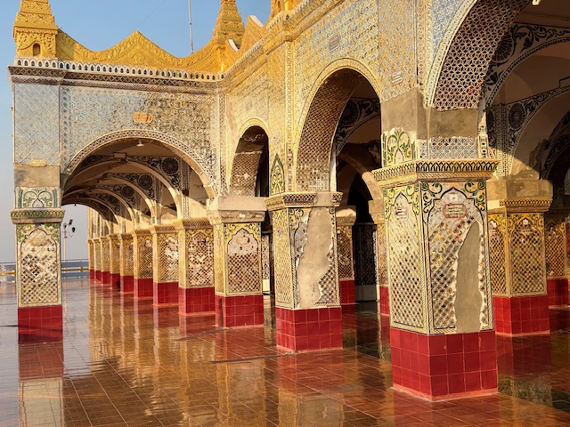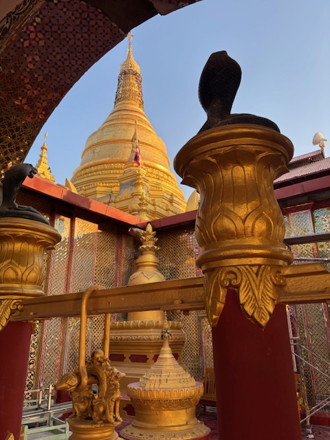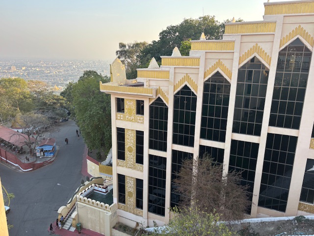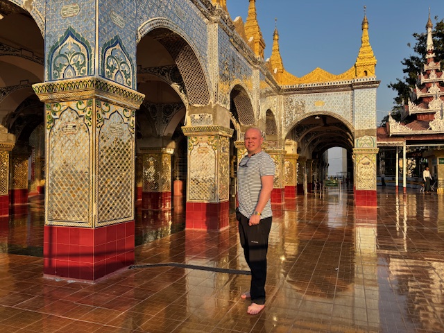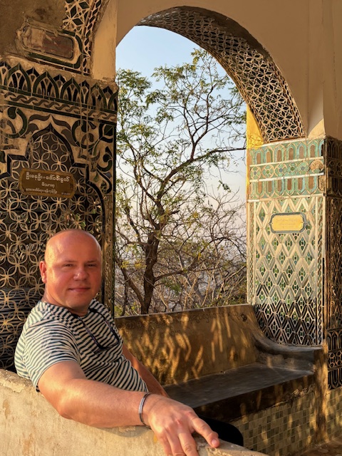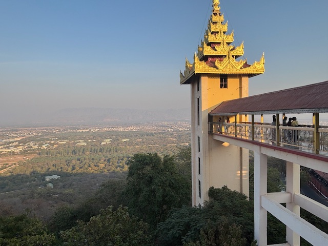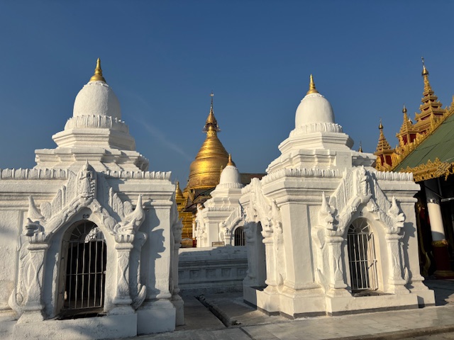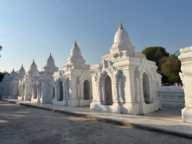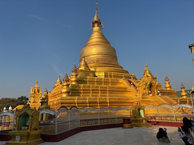 Na koniec odwiedziliśmy Pagodę Kuthodaw, nazywaną „największą księgą świata”. Nazwa nie jest przypadkowa – buddyjskie pisma wyryto tam na 729 marmurowych płytach. Dzień zakończył się pięknym widokiem zachodzącego słońca ze Wzgórza Mandalaj i trudno było o lepsze zwieńczenie tego dnia. Chociaż nie, wpadłem jeszcze na kolacje w hotelowej restauracji gdzie od 2 dni byłem jedynym gościem. Osobliwe to było uczucie siedzieć w pojedynkę jakby na olbrzymiej sali balowej gdzie kelnerzy tylko czekali na jedno moje spojrzenie i zaraz przybiegali pytać czy czegoś mi nie brakuje.