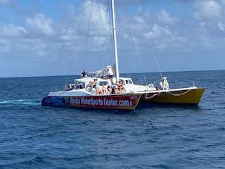 Skusiłem się na rejs katamaranem i nurkowanie z rurką. Wśród całej grupy turystów najliczniejszą grupę stanowili Amerykanie i Kanadyjczycy. Było raptem po 9 a niektórzy z towarzystwa byli już na lekkim gazie. Zrobiło mi się szkoda na widok zwłaszcza jednego chłopaka, na oko dwudziestoparolatka, mającego za kompana nabitego mięśniami ojca, no chyba że to nie był jego ojciec tylko papi. Chłopak miał ewidentnie przekrwione oczy, smutne, puste spojrzenie, ledwo trzymał się na nogach a jego towarzysz tylko wlewał w niego kolejne porcje wyskokowych trunków nadając niesamowite tempo temu wczesnoporannemu alkoholowemu maratonowi.